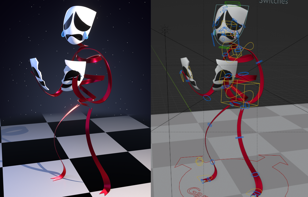 - A grease pencil version of her arms and legs, which use geometry nodes to convert a grease pencil line to her ribbons. (See last image above) (NOTE: This feature requires the "Grease Pencil to Curves" node, which was introduced in Blender 4.3. If you want to use this feature, you need that function.)