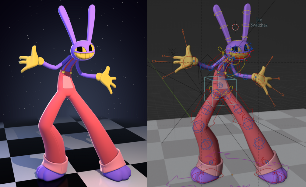 A fully rigged fanmade model of Jax from The Amazing Digital Circus, built in Blender 4.4. Includes a .blend file and necessary textures. Rig created partially using Rigify.